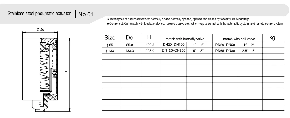 - 단동식 액추에이터: 스프링 재설정 기능이 장착되어 공기 공급 중단 시 자동으로 원래 위치로 복귀하여 높은 안전성 보호 기능을 제공하며 높은 안전 요구 사항이 있는 시나리오에 적합합니다.